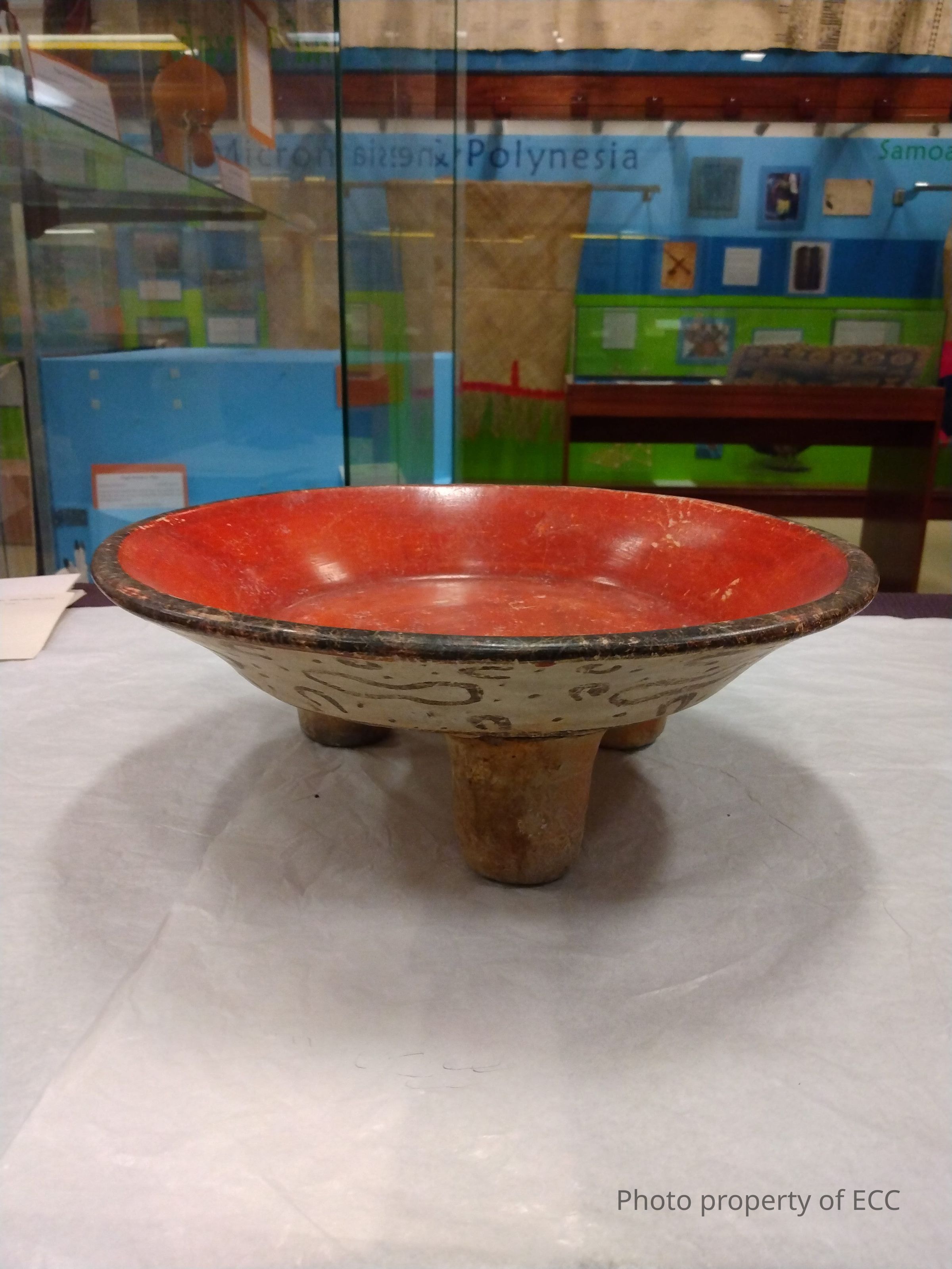 A polychrome tripod bowl with rattle legs. Painted red and white with what looks to be a jaguar spot design, one of the legs has been broken off and repaired. Small scratches adorn the edge of the bowl, and as well as some wearing off of the paint.Collection