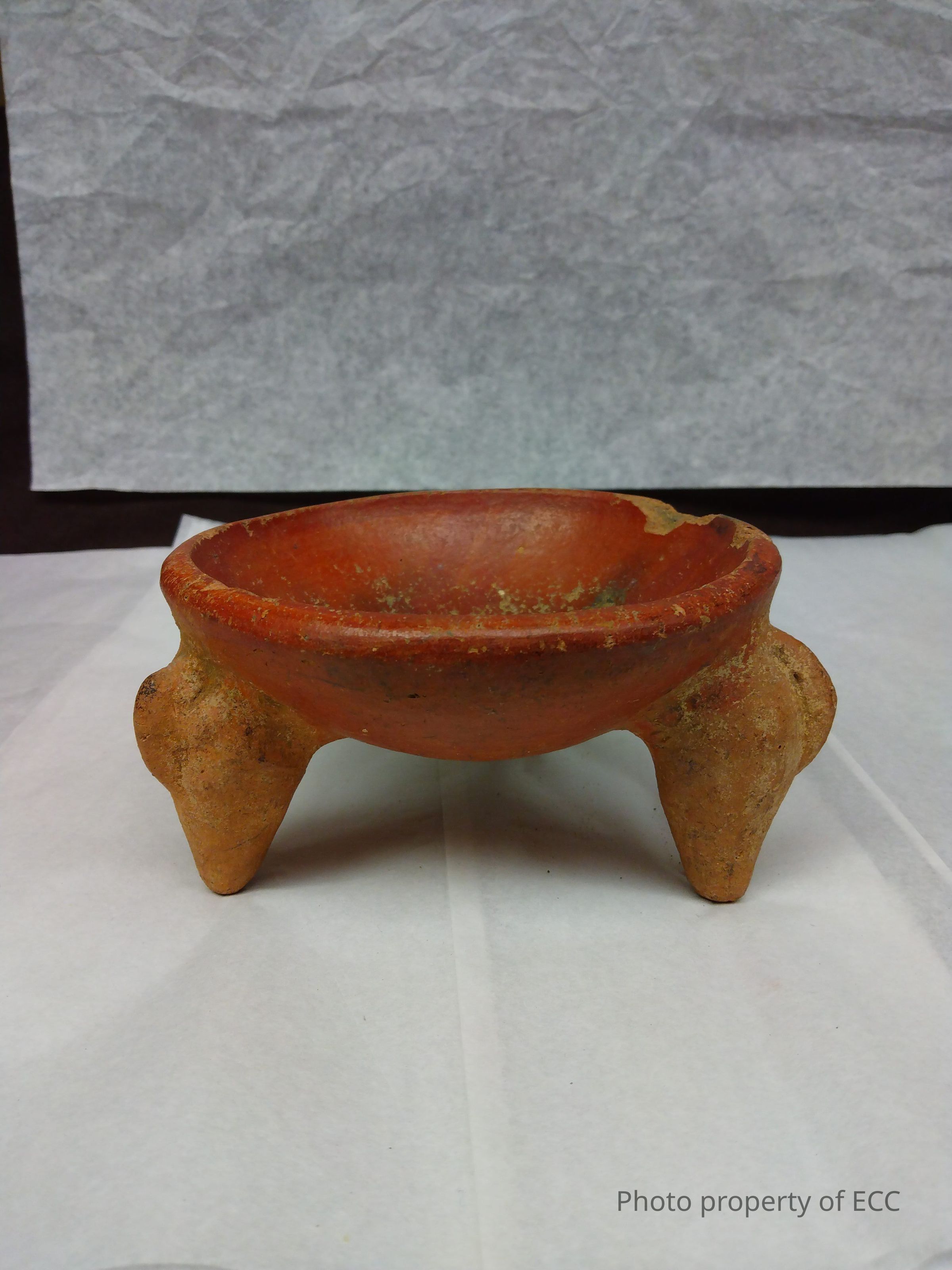 Round reddish-brown bowl on three legs. All three legs are cone shaped with a protrusion from top, giving the impression of a bird with a head crest. Bowl has a large chip along the edge, and all three legs are faded in color. Inside of bowl looks to have been scrapped and eroded, with light fire clouds. Lastly, there are black spider lines across the bottom.Collection