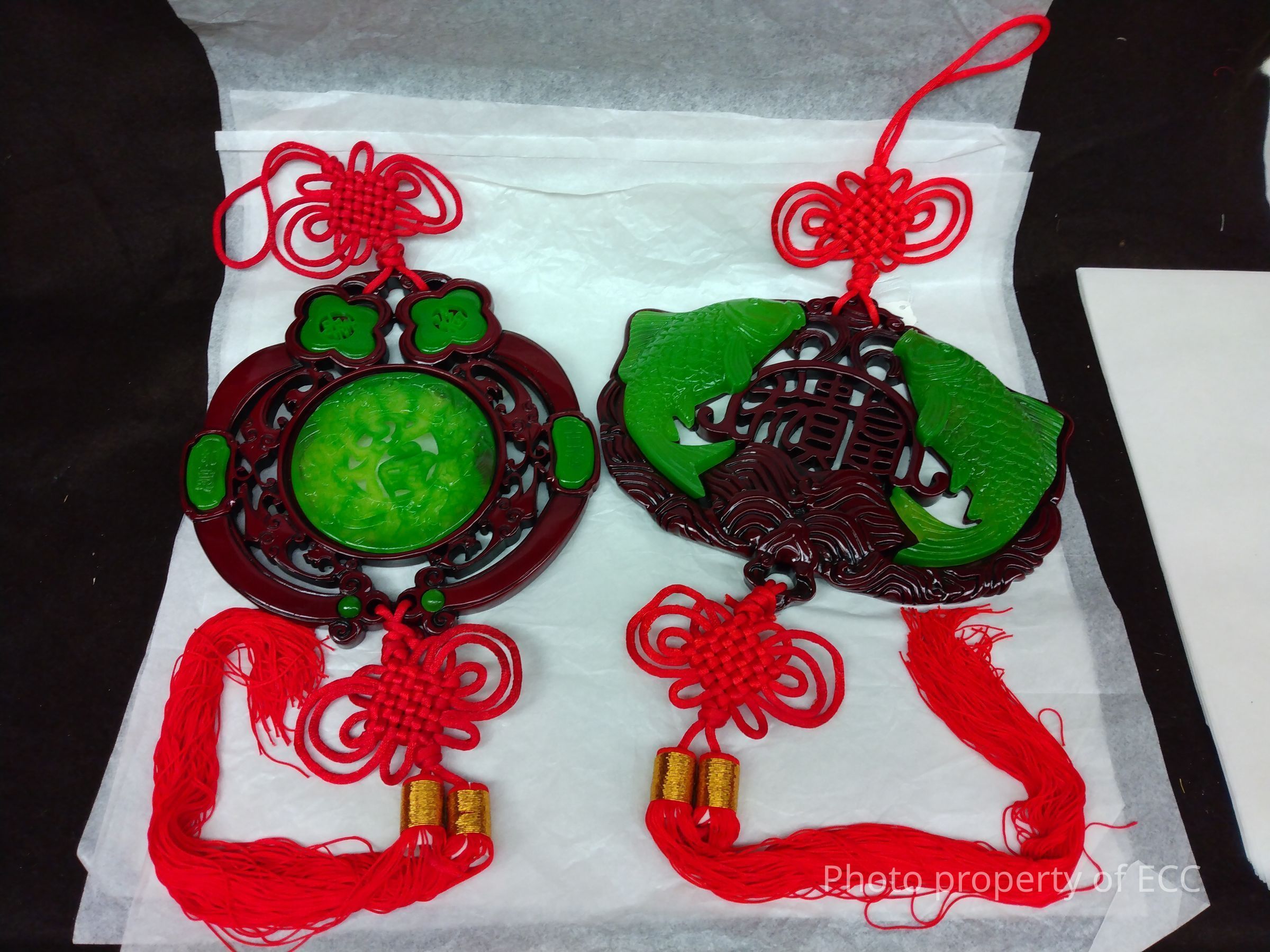 Object A is a dark red with jade fish on the left and right. The design is mostly symmetrical, besides the middle where there is writing engraved in the wood. The top has a red cord tied in a design, with a loop at the top to hang it. The bottom has a similar knotted design as well as two long red tassels. Object B is dark red carved wood with jade decorations. It is mostly symmetrical except for some writing in jade. There is a design of dragons or birds in the center circle of the jade and in the wood surrounding it. There is a knotted red design at the top to hang the object. The same knotted design is at the bottom as well as two long tassels.Collection