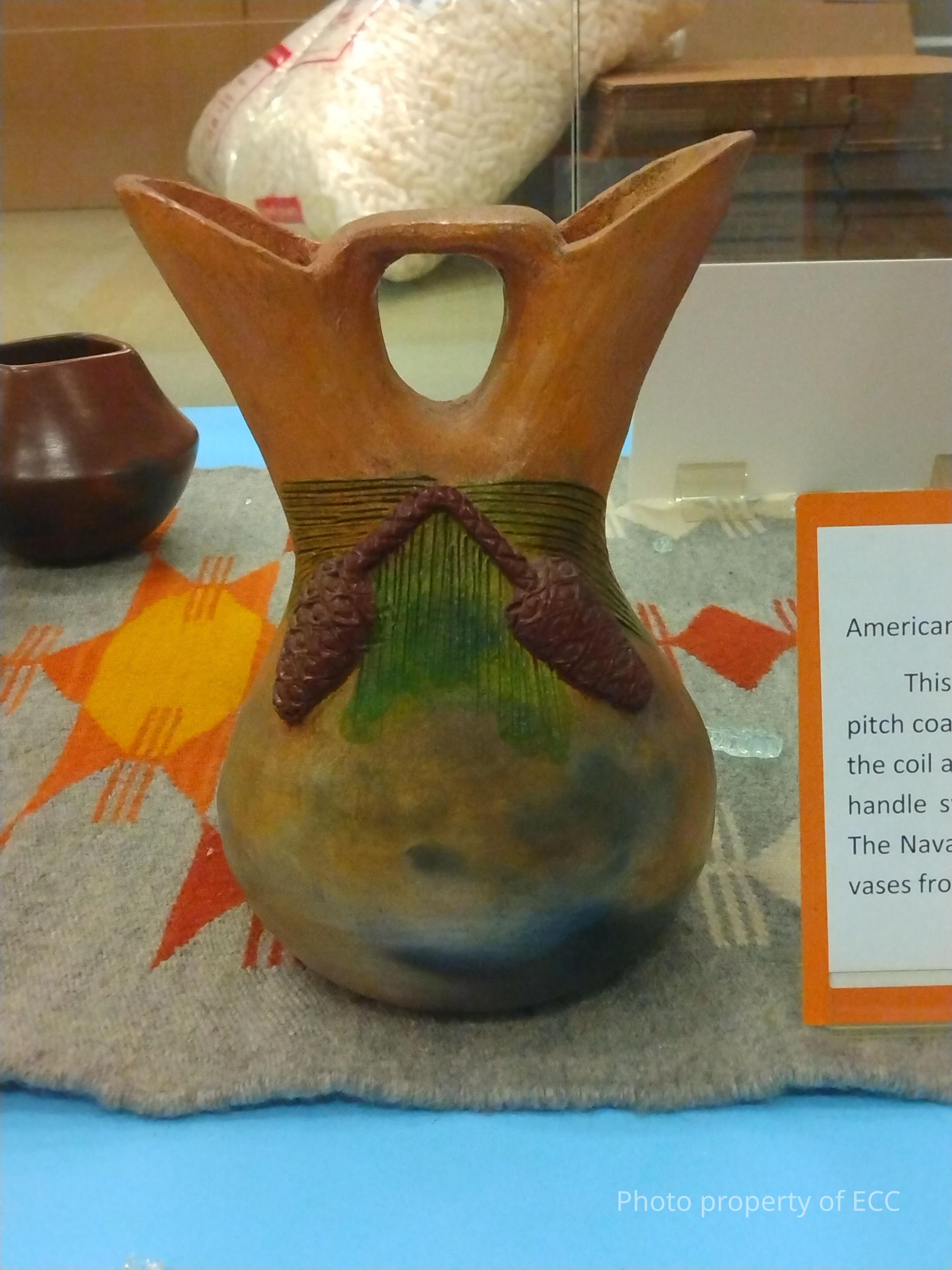 A wedding vase that has been pinon pitch coated and painted with pine cone applique. It was handmade via the coil and scrape method and native clay. The bottom is signed "S.B. CLAW" for Silas Claw.Collection