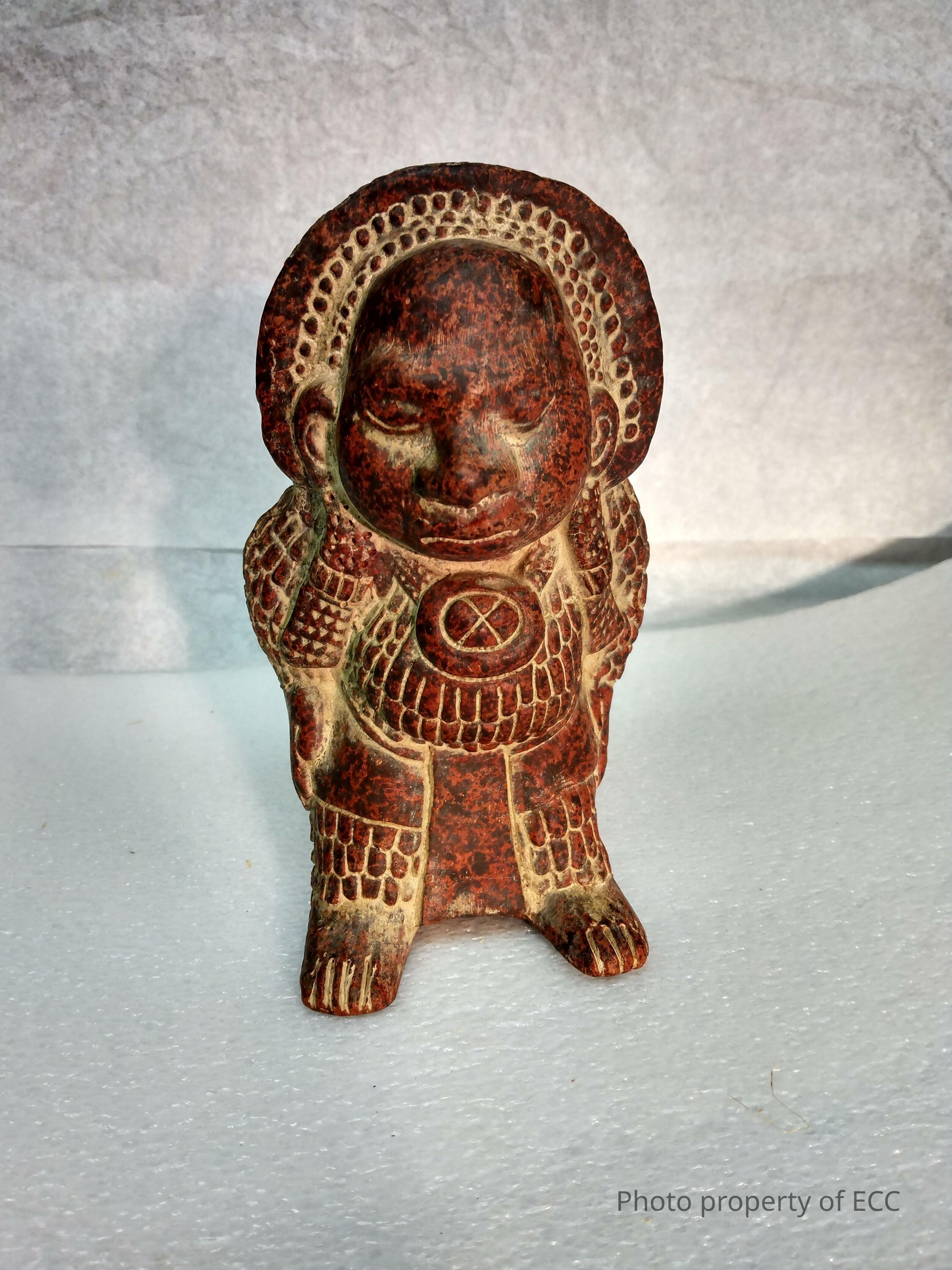 A figure of a person wearing some type of headdress decorated with beads or shells. The figure is wearing a necklace with a round pendant with and X on it. There is a scale or feather pattern on the arms, legs, and torso. At the back of the figure there is a rectangular hole cut at an angle like what you would see on a whistle. It is made of red ceramic clay with black speckles throughout. It is dusted with white or yellow clay to give it and old look.Collection