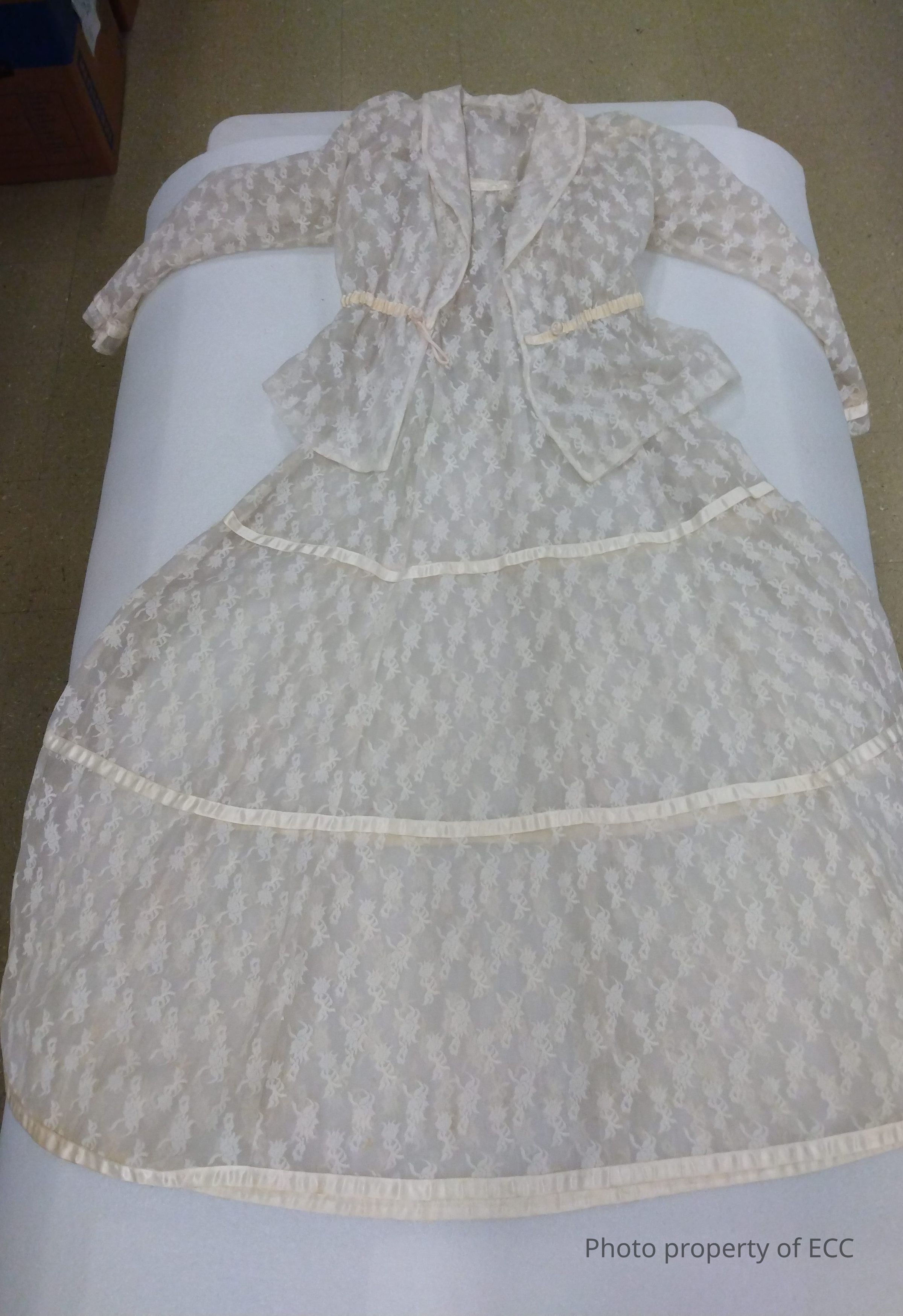 A: White/transparent dress with flower patterns throughout its entire body, horizontal lines on the bottom half, and flower-like cuffs with beads on both arms. Dress has brownish stains throughout dress (likely due to age), faded color/quality, cuffs and horizonal fabric lines slightly worn (few strings)