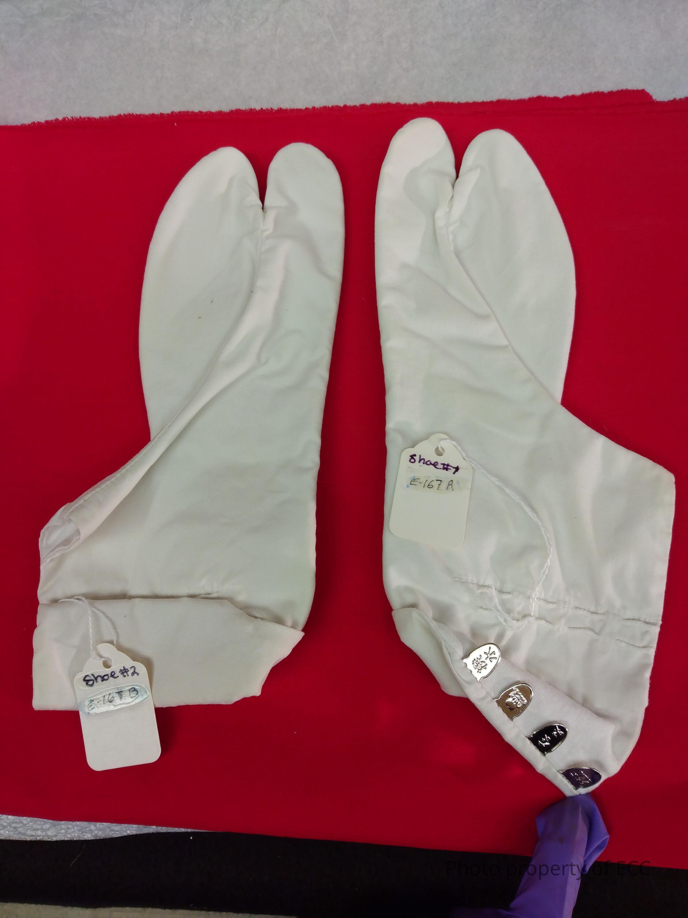 A set of white Japanese tabi socks. In good condition, these socks have four silver latches of various symbols engraved into them. The first reads 22.5 (perhaps the size of the sock), the second, a Japanese writing symbol, thirdly a Buddha or lord, and lastly another Japanese writing symbol.Use