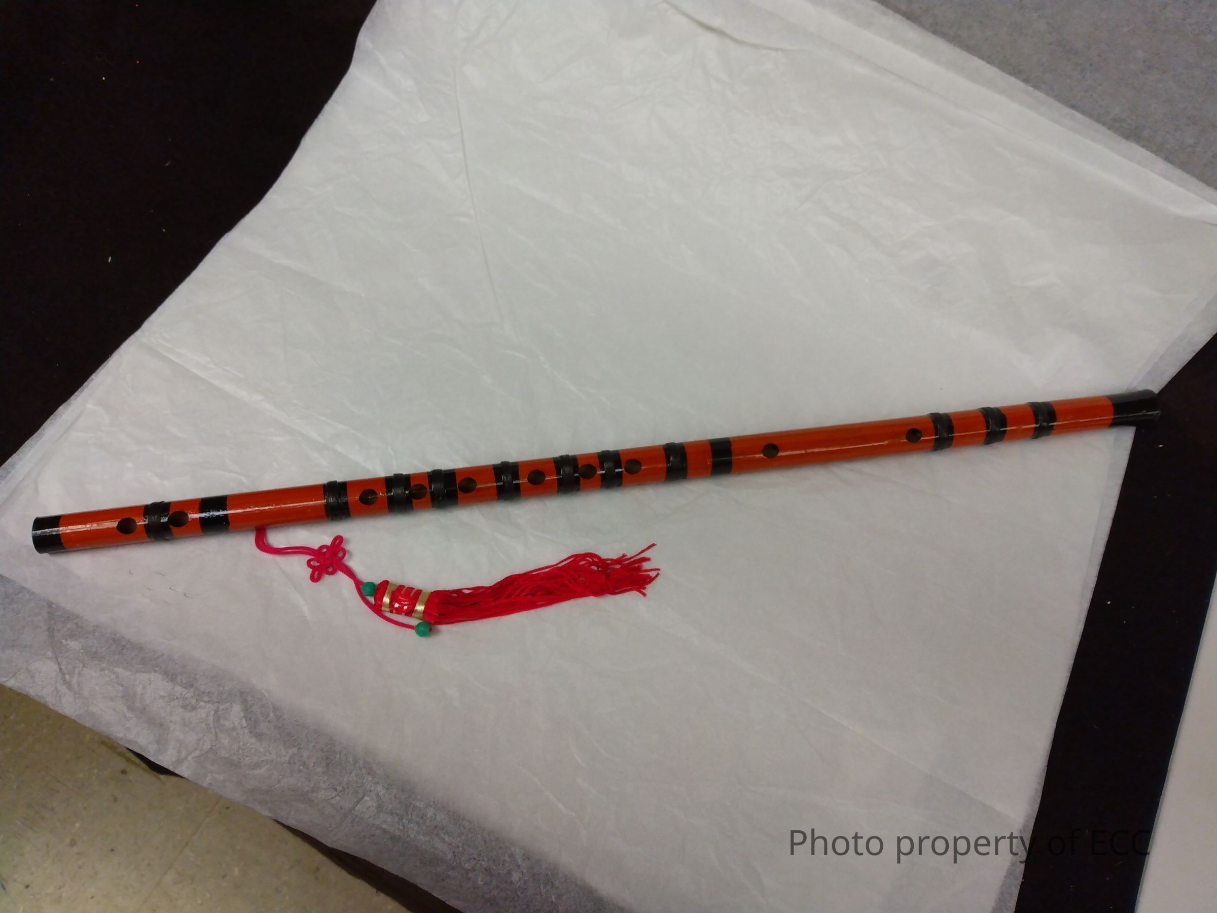 Orange/brown color flute with many bands of black around it. There are ten holes to play on the front side. Two holes on back where tassel is secured. The tassel is red with green beads.Collection