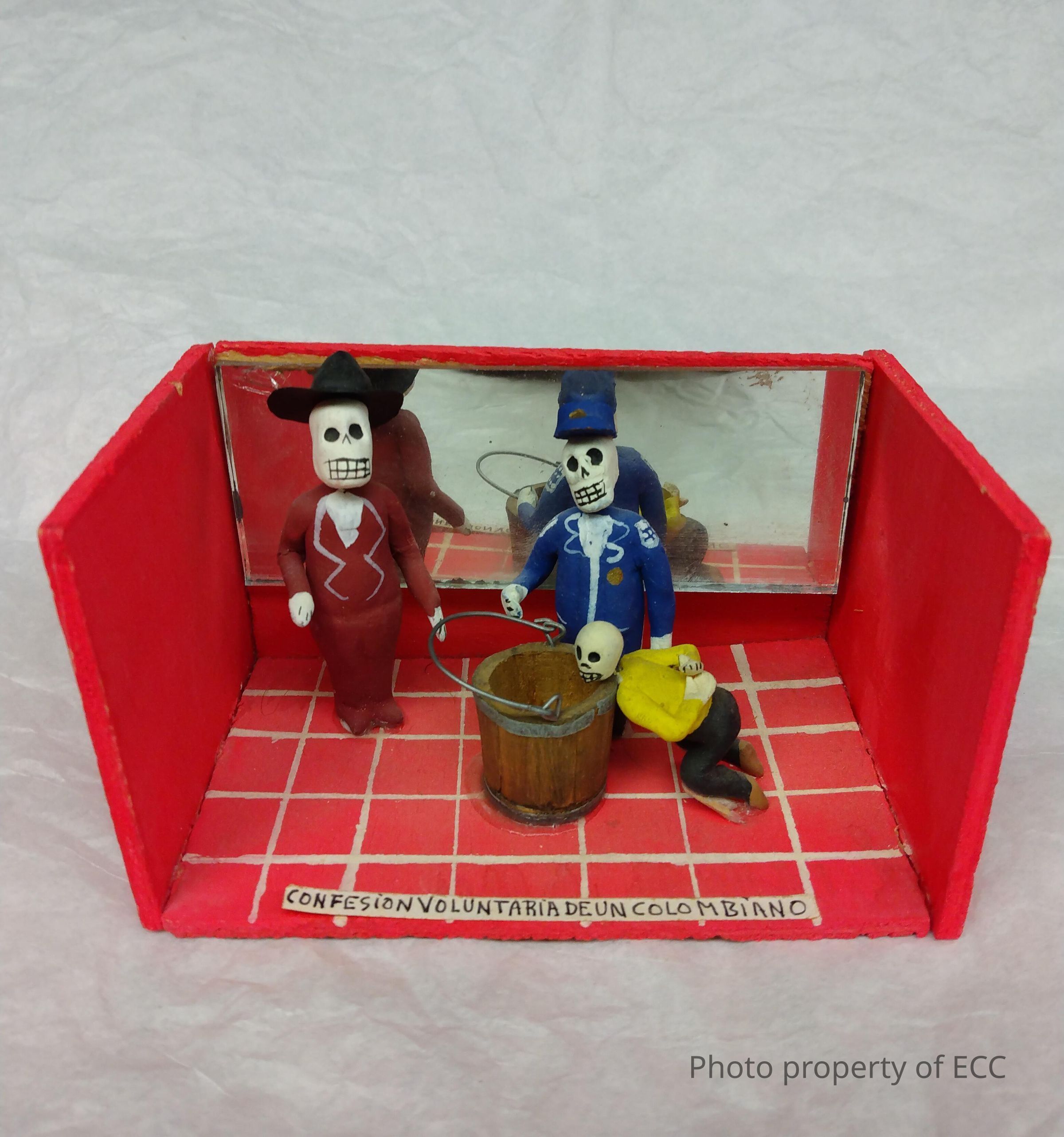 A wood and clay miniature scene of two skeleton men standing over a third skeleton man, whose head is being forced into a bucket. The small wooden box the scene is in is red, with a small mirror on the back panel. One man is dress in what looks like a policeman's uniform, while the other is in a maroon suit with a black hat. The man kneeling has his hands tied behind his back and is dress in a yellow shirt and black pants. A small paper description of the scene is glued to the bottom in Spanish, "Confesion voluntaria de un Colombiano" (Voluntary confession of a Columbian)Category