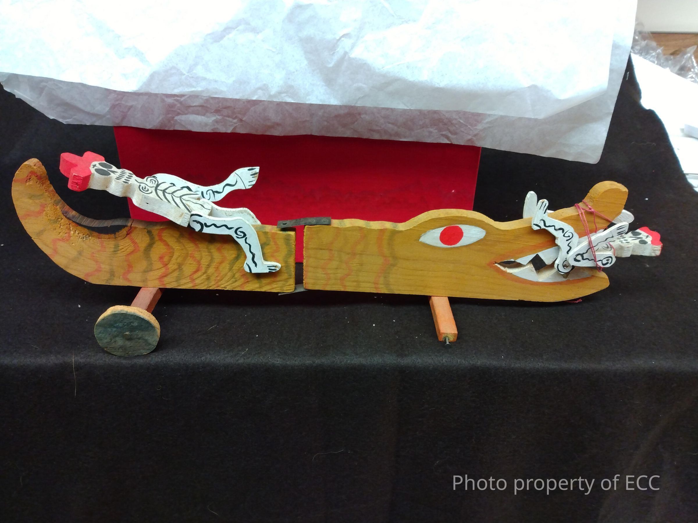 Wooden figure of a serpent with wheels, but one is missing. There is a scale design on the body of the snake. A skeleton man is riding on top of the snake, and another is being eaten. The figure folds in the center and the skeleton man on top can be folded back.Collection