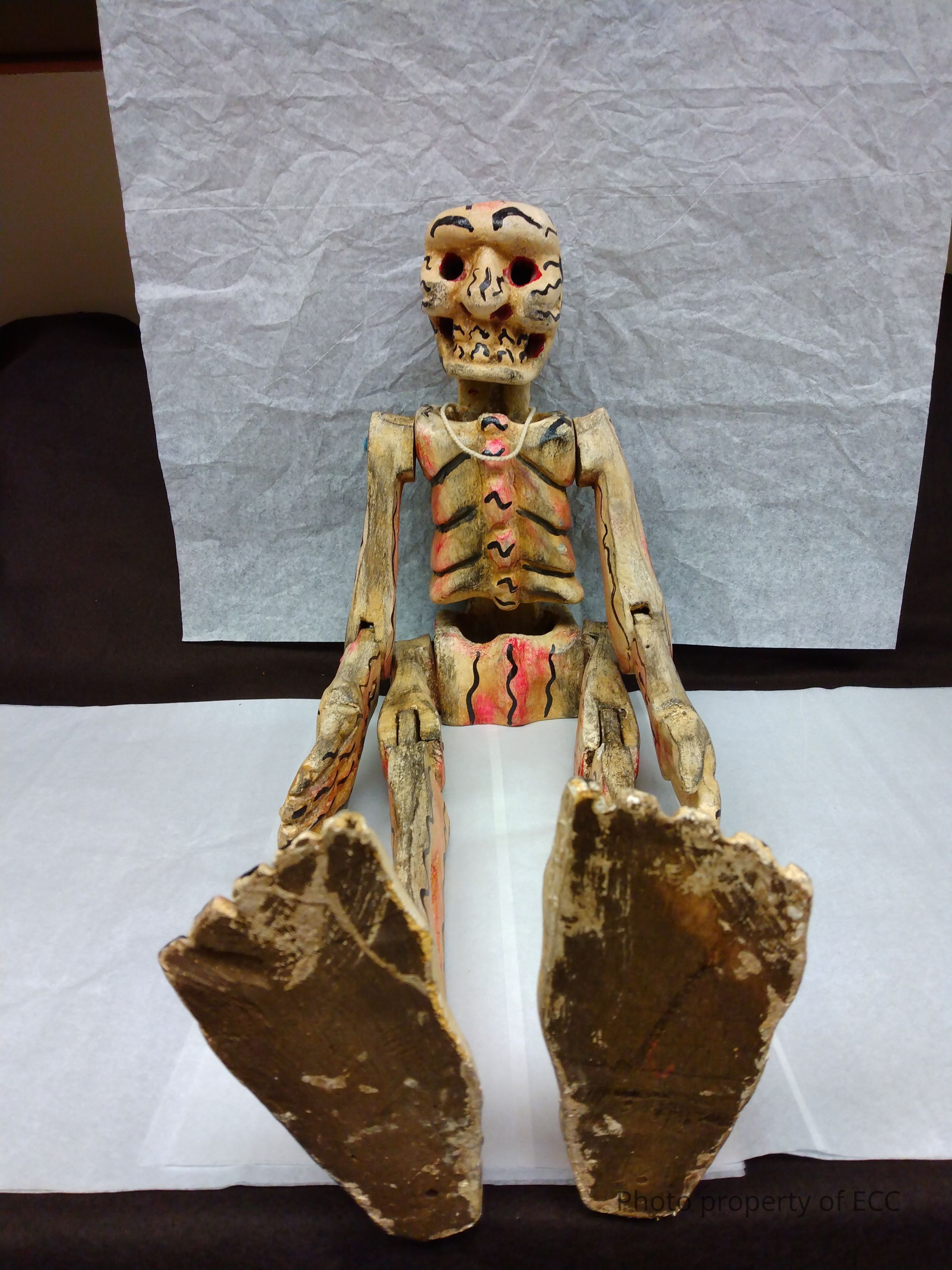 A white bone colored wooden skeleton with working joints. There is red detailing in the eye sockets, ear holes, mouth openings, down the sternum, pelvis, and lightly painted most of the body. There is black drawn detailing where bones would be. The hallow ribcage and pelvis has blue string running through it. The blue string is visible at shoulder joints and outside hip joints. All the joints are in working order.Collection