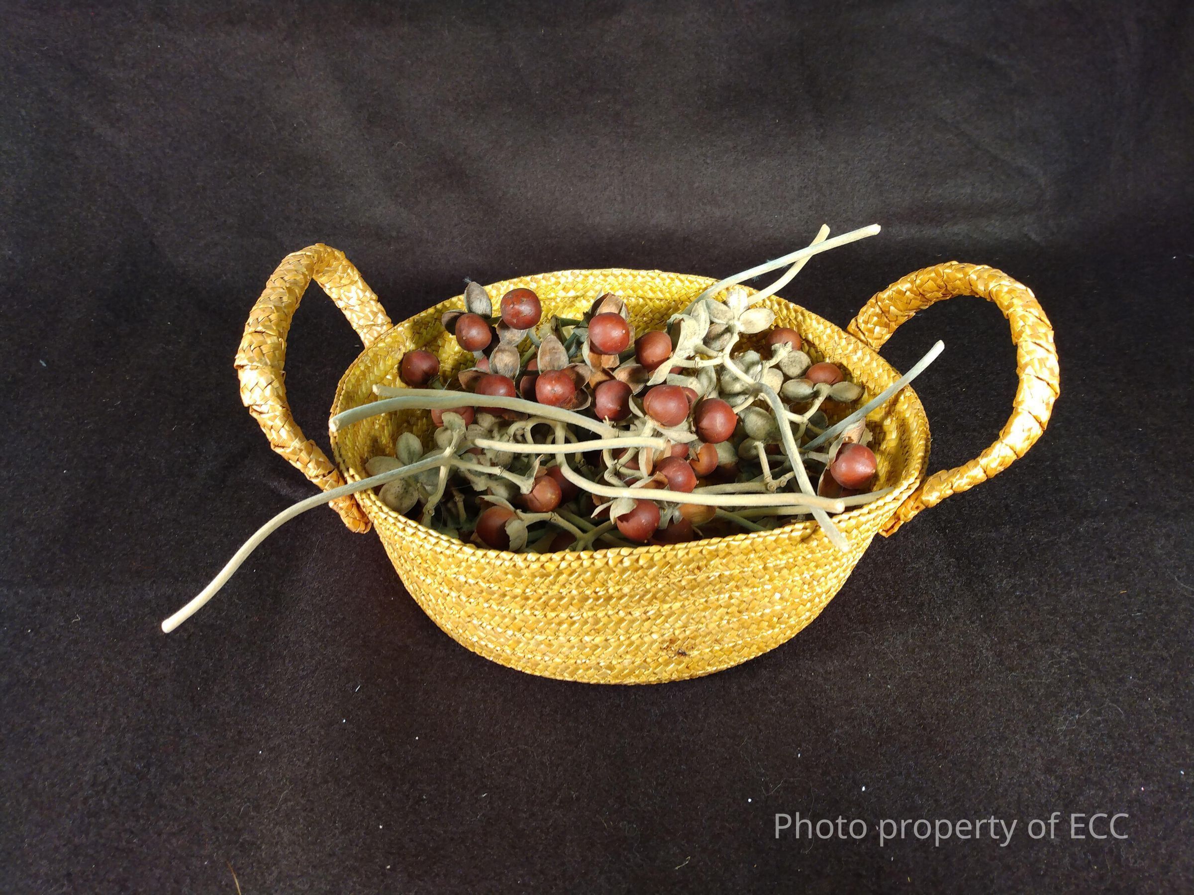Grass baskets have a variety of uses. In this case it's being used to hold a type of seed pods.Collection