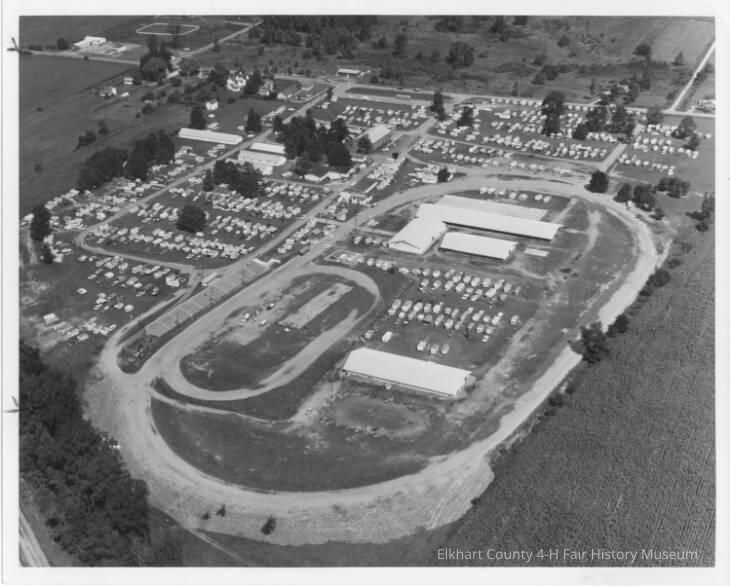 August 26-29, 1965, was the Third Annual Heart City Rally at the Elkhart County Fairgrounds in Goshen. The event was held in conjunction with the Mobile Home Show held at the Northside Gym in Elkhart. This aerial photograph of the fairgrounds shows the more than 600 campers reported to have been registered for the three-day program. Most of the units included travel trailers, truck-mounted campers, soft top campers, mobile homes, and tents. Registration began on a Thursday. The program included bus rides to the Mobile Home Show in Elkhart, teenage record hops, pancake breakfasts, a white elephant sale, horse shoe pitching, a chicken dinner, and an interdenominational service to conclude the rally on Sunday. According to organizers, record attendance was set for that year.