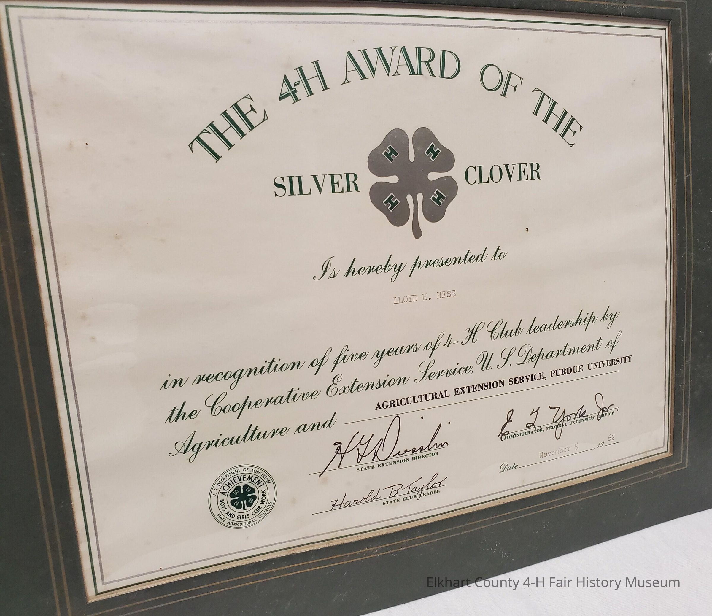 Silver Clover Award to Lloyd Hess - 1962 - Serving 5 years of Club Leadership