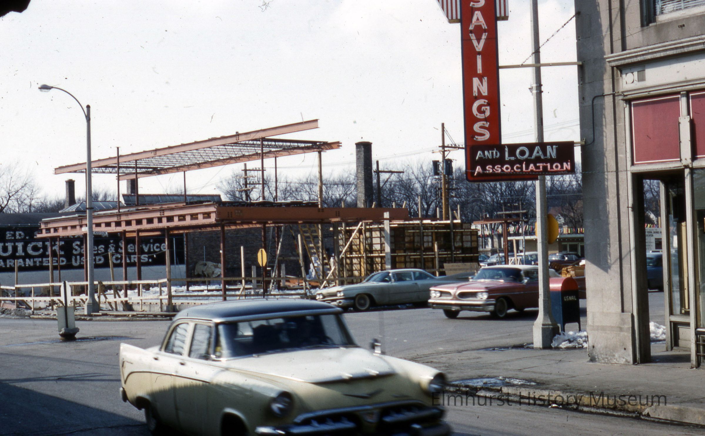 Elmhurst Federal Savings and Loan building under construction on the northwest corner of First Street and N. Addison Avenue. The original Savings and Loan location is in the foreground at right.