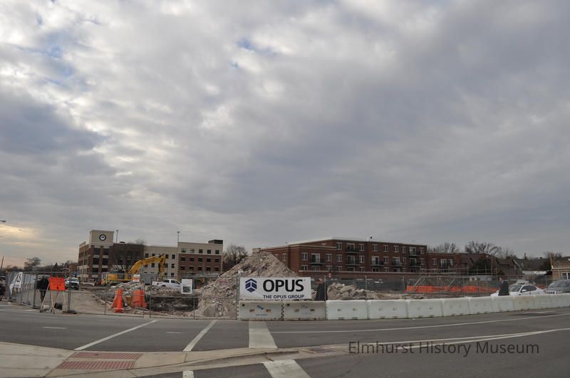 Demolition site of 100 N. Addison, following the tear down of the Elmhurst Federal Reserve and Savings Bank building. Future site of the Opus Development apartment complex, The Marke.Photograph Details