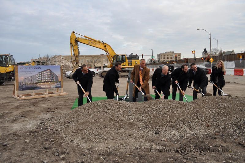 Opus Development Groundbreaking at 100 N. Addison, following the demolition of the Elmhurst Federal Reserve and Savings Bank building. Future site of the Opus Development apartment complex.Photograph Details