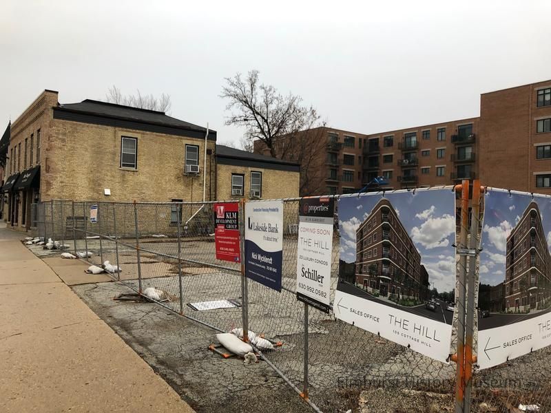 Vacant lot at 105 S. Cottage Hill Avenue, future site of "The Hill" Luxury Condominiums, lookingeast. The Graue Grocery Store building at 138 W. Park Avenue is seen in the background.Photograph Details