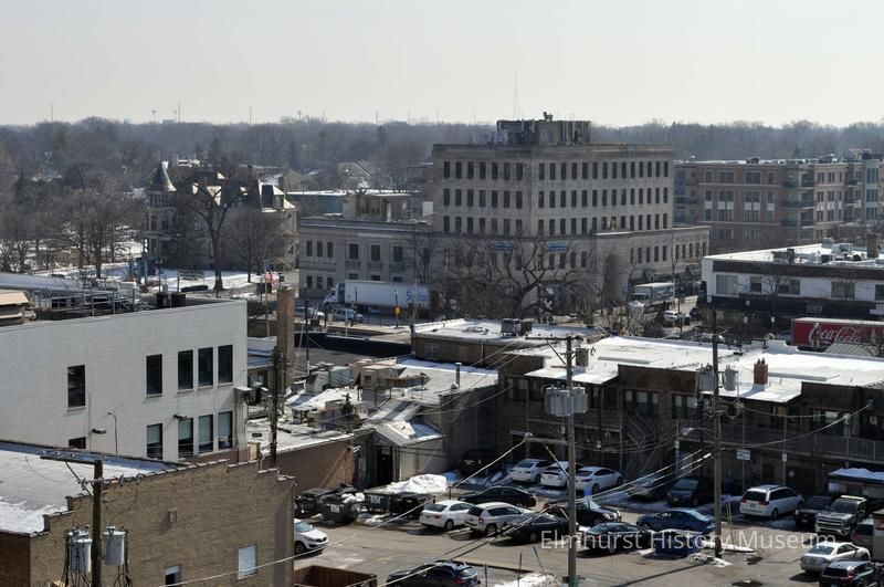 View of the bank building at 105 S York from Addison Parking Deck, looking southeast. The Glos Mansion is visible at left.Photograph Details