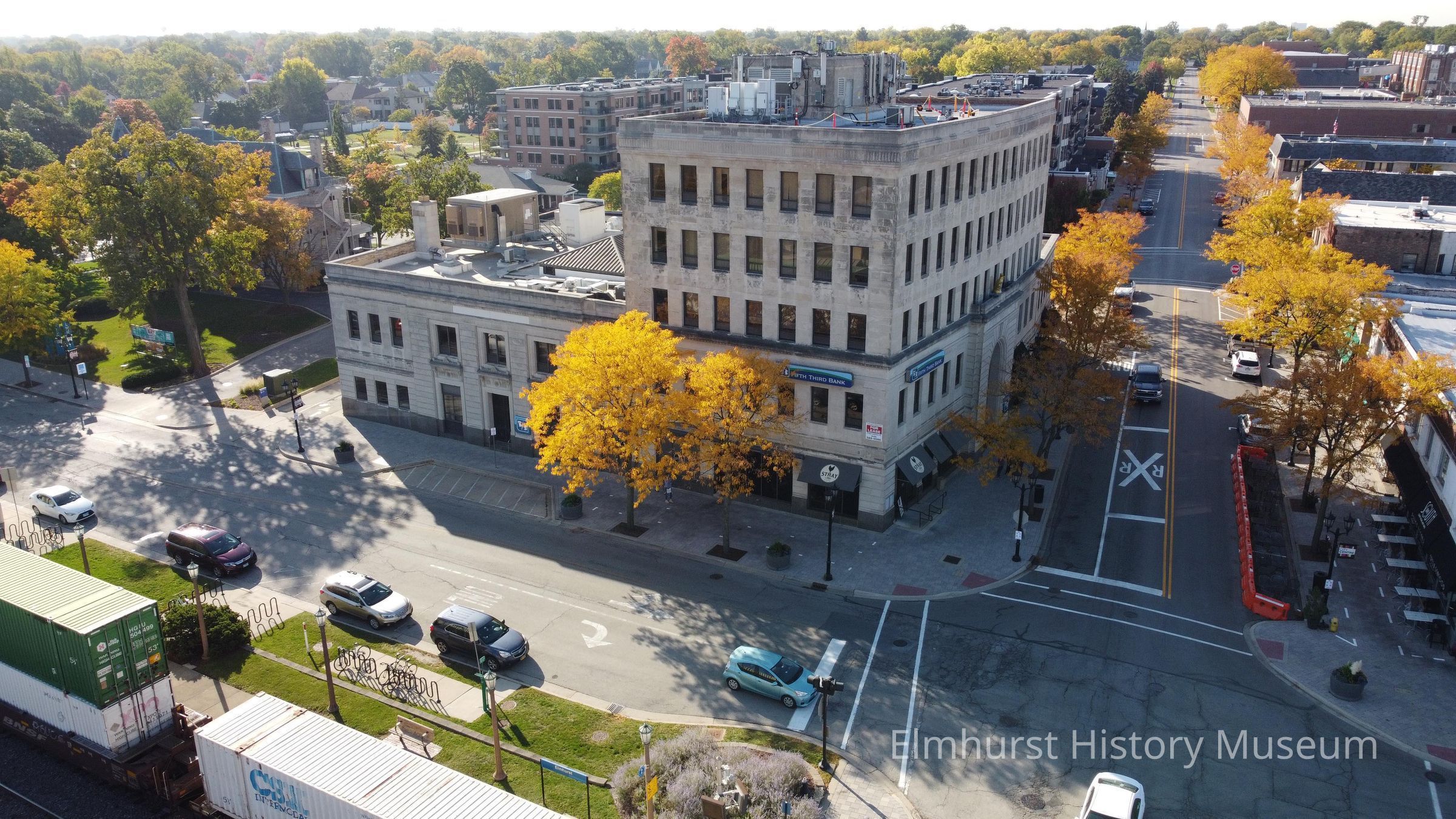 Aerial view of the Fifth Third Bank, formerly Elmhurst National Bank, at the southeast corner of S. York Street and E. Park Avenue, looking south.Photograph Details