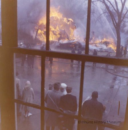 Former Charles Bates' property at 112 Adell, on the corner of Adell and Adelaide Street. The house was in disrepair, and the Elmhurst Fire Department set it on fire to demonstrate new fire-fighting equipment and techniques.Photograph Details