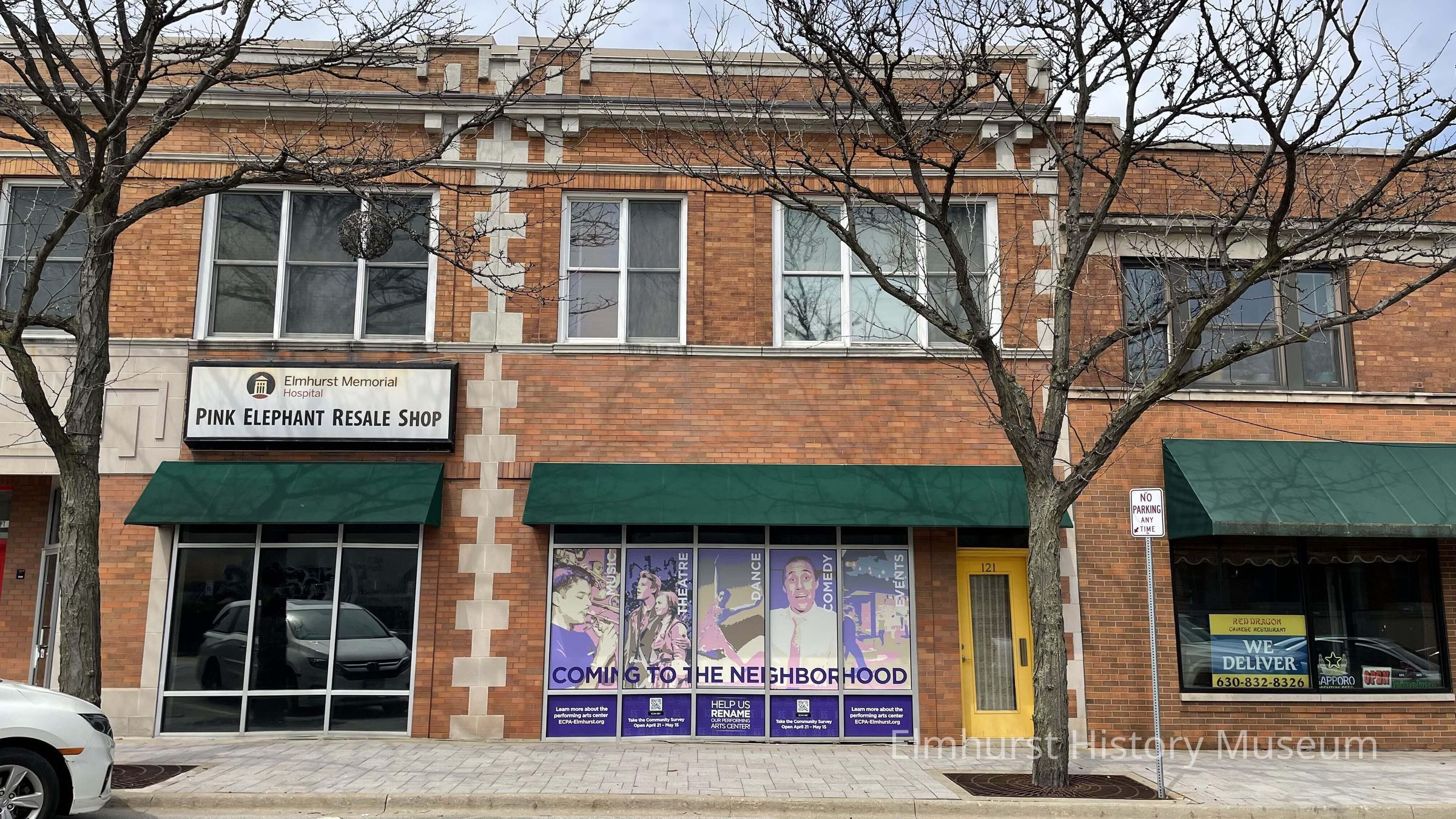 Vacant Storefront at 121 W. First Street with window advertising future home of the Elmhurst Center for Performing Arts.Photograph Details