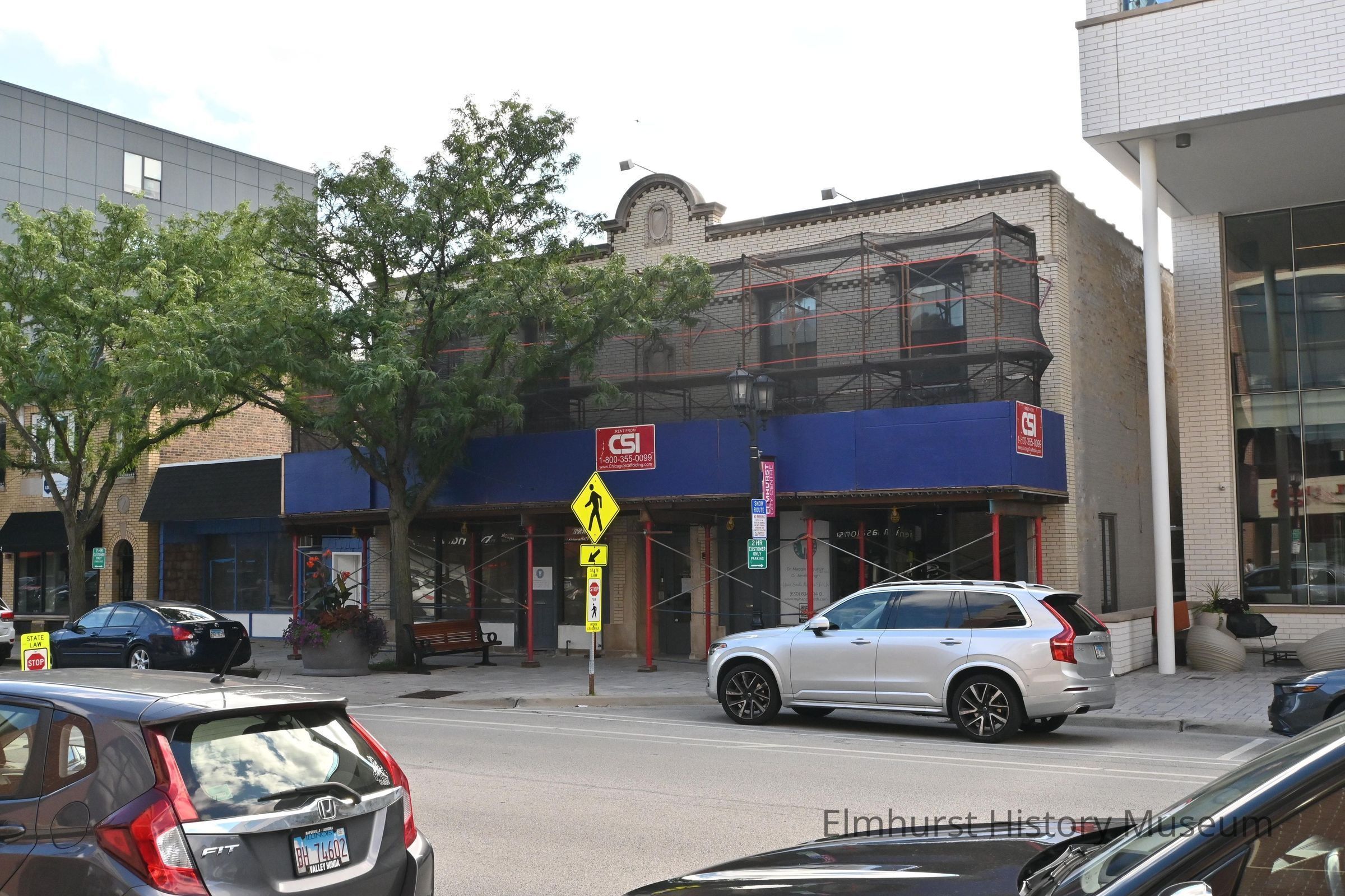 Commercial building at 130-132 N. Addison Avenue, covered with scaffolding.Photograph Details