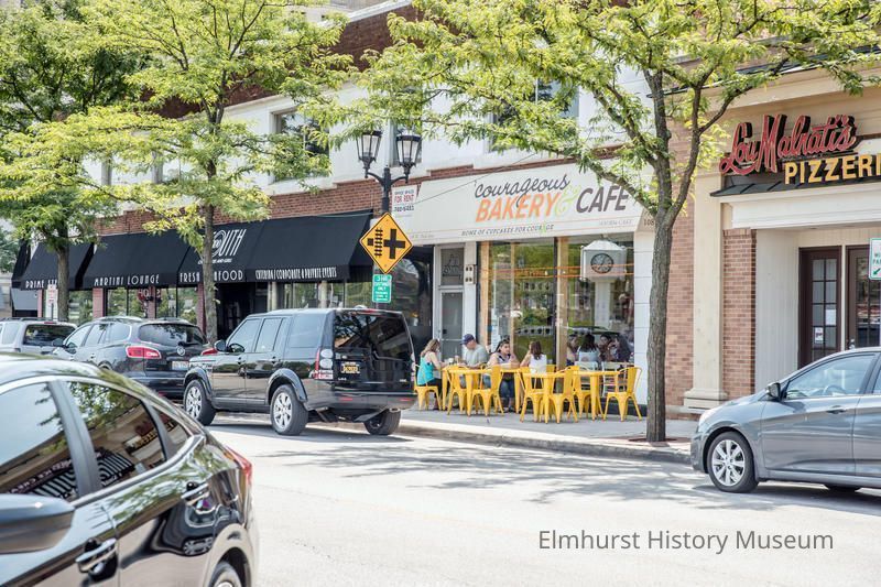 Courageous Bakery & Café at 108 W. Park Ave. 100 South Chop House and Lou Malnati's Pizza are visible to the left and right of the bakery.