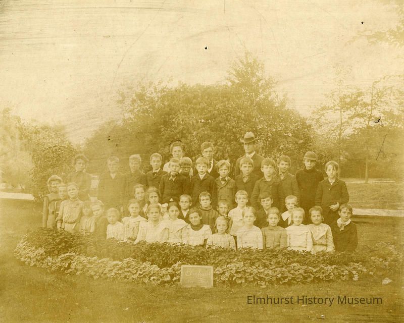 Sepia-toned photograph mounted on cardboard, students outside at Hawthorne School on Cottage Hill and Arthur. "Elmhurst 1902 Room Four"