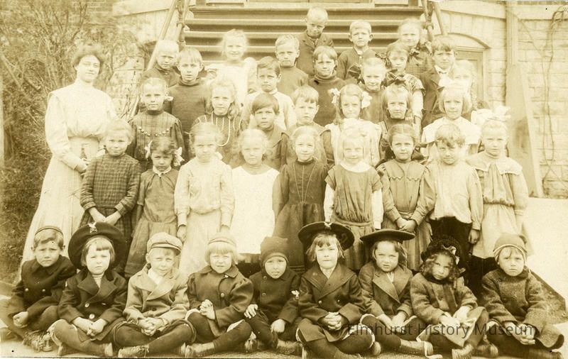 Kindergarten and first grade students in a group portrait at Hawthorne School on Cottage Hill Avenue and Arthur Street.