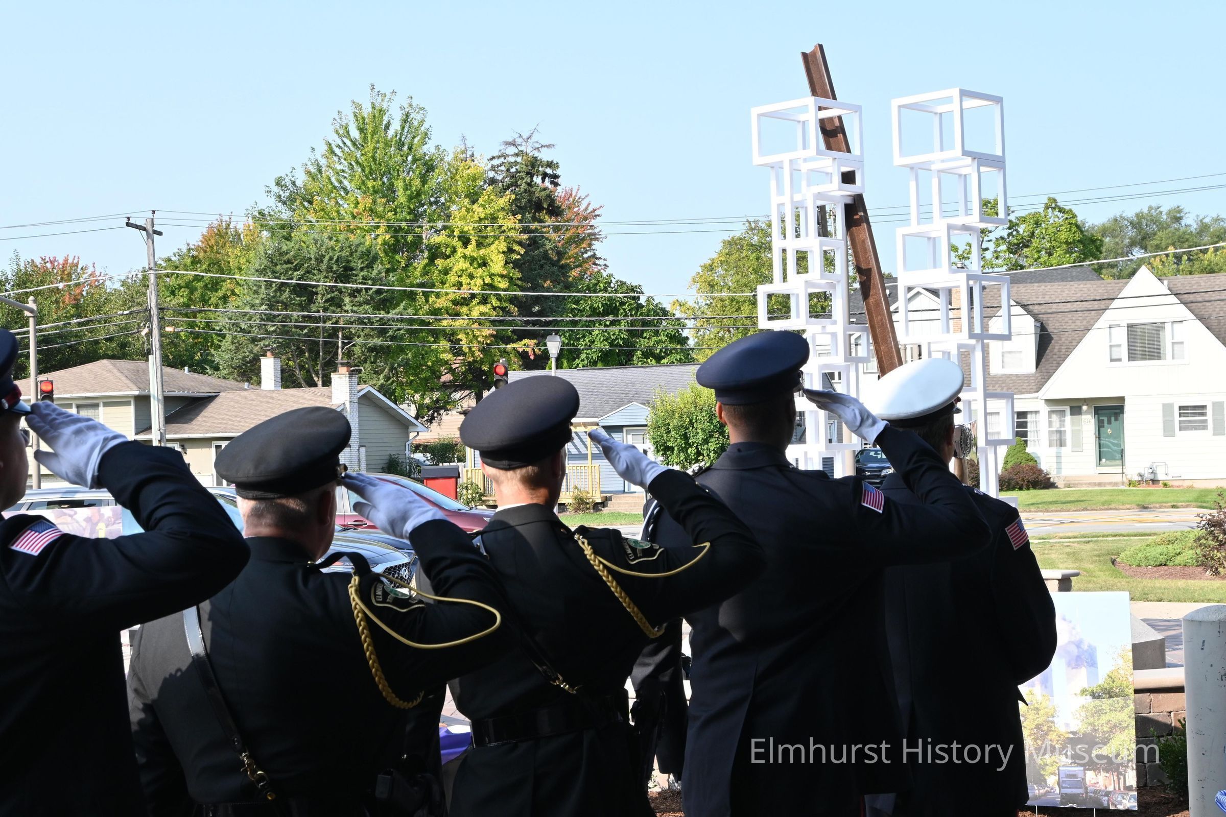 Fire department color guard marches at the dedication ceremony for the First Responders Memorial at Fire Station No. 2 at 605 S. York Street.