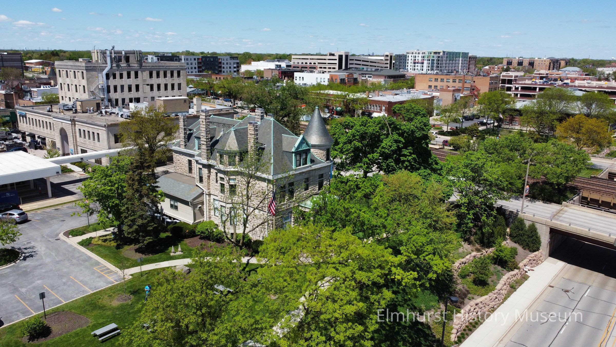 Aerial view of Glos Mansion and Downtown Elmhurst, looking northwest from above Robert Palmer Drive.