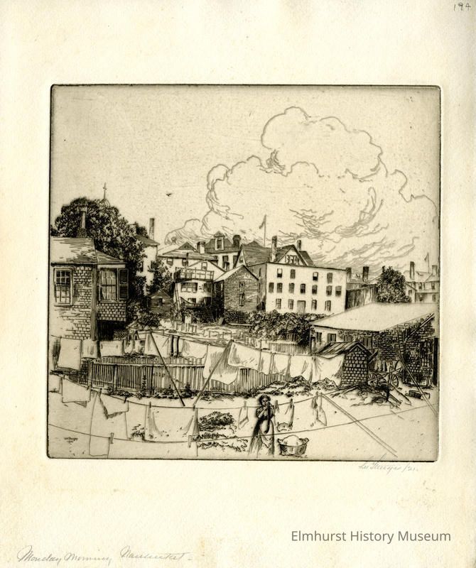 Etching of a town with a woman hanging her wash on a clothesline in the forefront. Signed and dated.