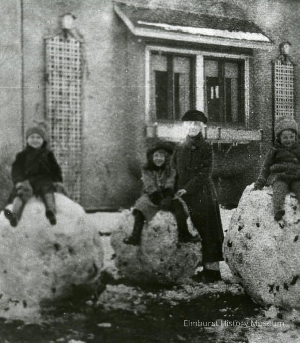 Three young children, identified as Eleanor, Margaret and Ruth Hall, in snowsuits sitting on huge snowballs, with an adult, Sarah Hall, standing next to Margaret posed by house at 177 E. St. Charles Road.Photograph Details