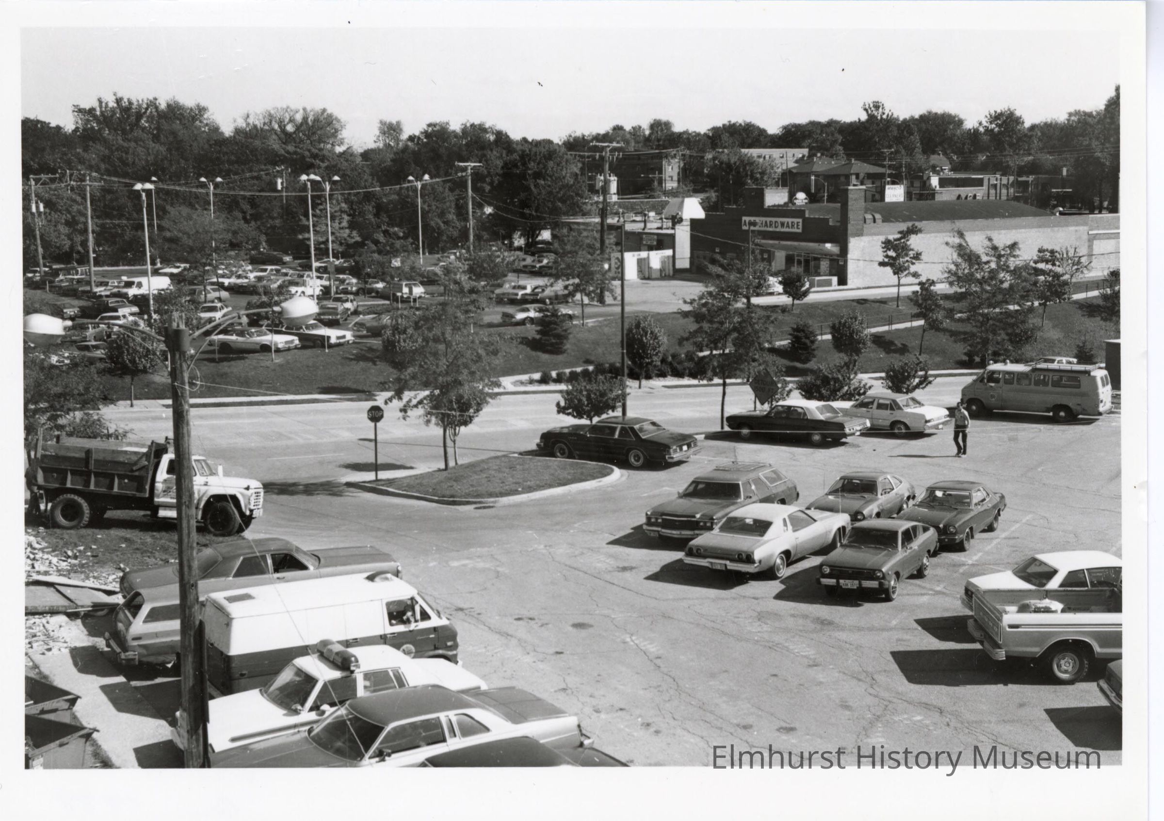 Exterior view of the north entrance to Ace Hardware located on W. First Street. Taken from Robert Palmer Drive Underpass. Parking lot with vehicles in the foreground.Photograph Details