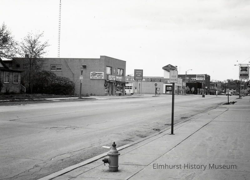 Street scene on Addison Avenue taken from sidewalk on west side looking south towards Second Street. Residential building, Bob's Barber and Beauty Supplies, Elmhurst National Bank drive-through and Good-Year Tires.