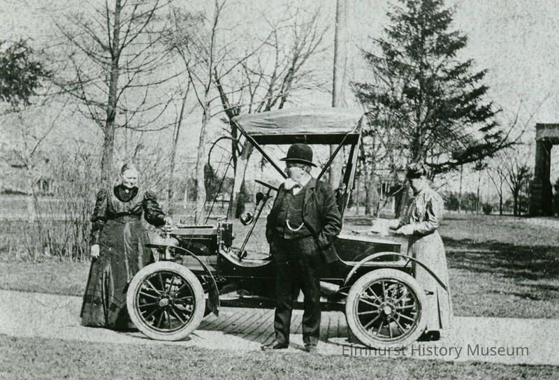 Dr. Henry Langhorst's parents, and his wife, Adelaide, is polishing their automobile in Elmhurst, a one-cylinder REO, purchased by Langhorst in 1907. Also includes a letter from Dr. Langhorst to Miss Strand, dated June 11 1956.Photograph Details