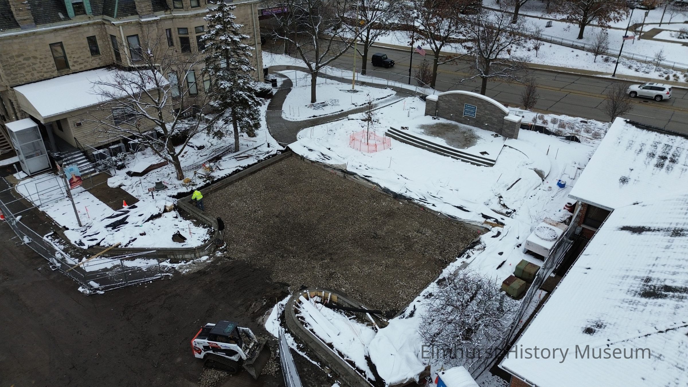 Aerial view of the unfinished performance space area between the Elmhurst History Museum and the EHM Education Center.Photograph Details