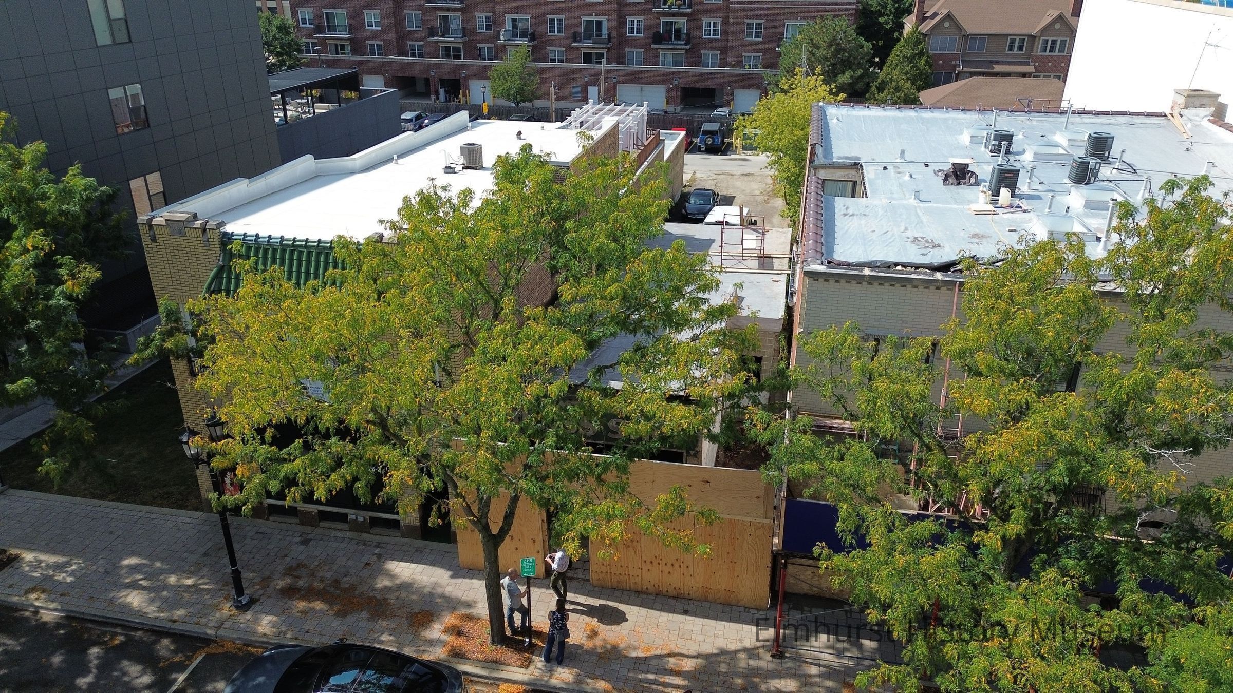 Aerial view of construction at 128 N. Addison Avenue revealing the Elmhurst Glass Shop signage on the building.Photograph Details