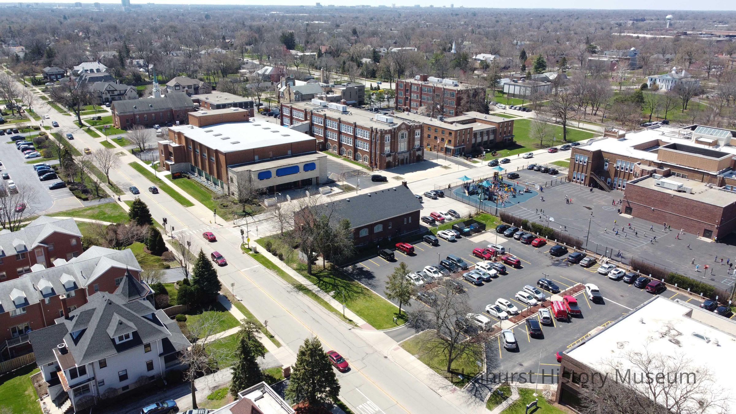Aerial view of the intersection of S. York Street and Arthur Street, looking southwest towards Immaculate Conception Church.Photograph Details