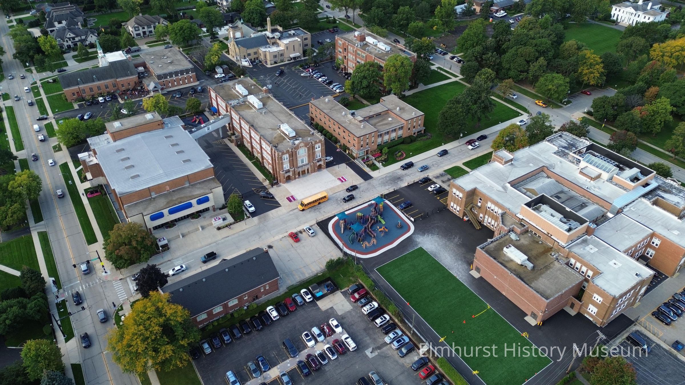 Aerial view of Arthur Street, looking southwest towards the Immaculate Conception campus. Hawthorne School is at right, and St. Peter's Church and First United Methodist Church is in the background.Photograph Details
