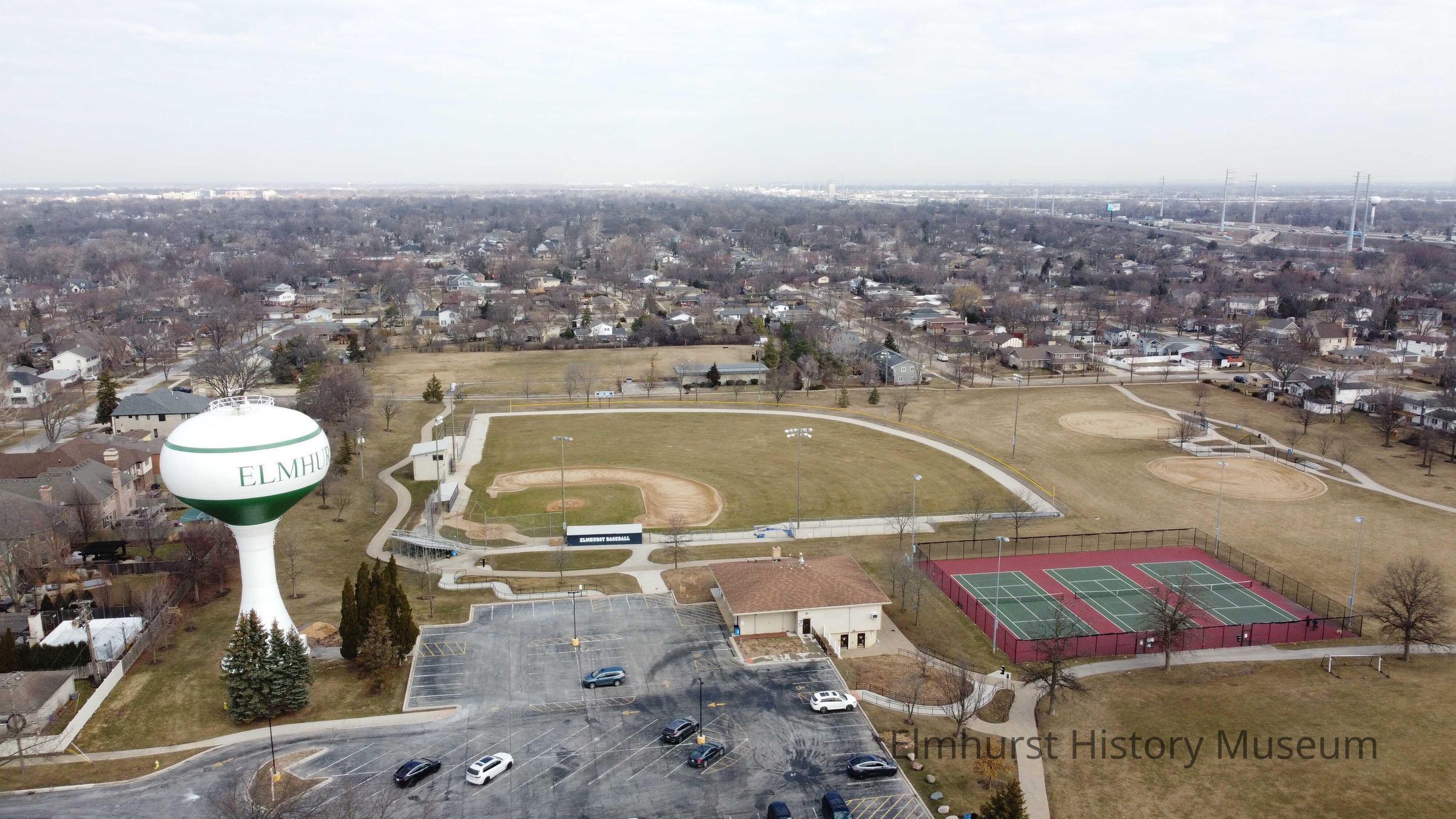 Aerial view of the baseball diamond and tennis courts at Butterfield Park, looking north from Butterfield Road.Photograph Details