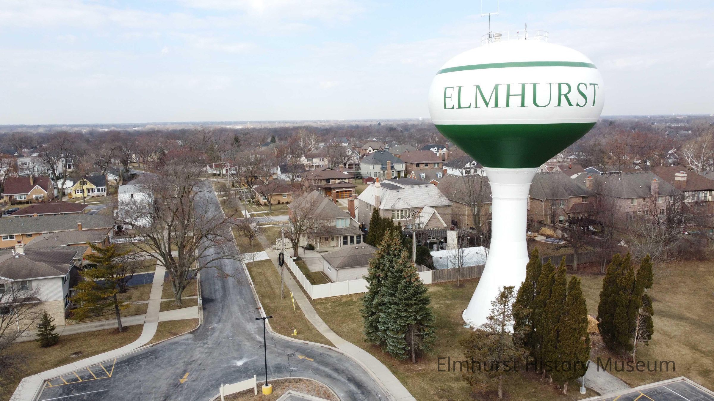 Aerial view of the water tower at Butterfield Park looking west down E. Adams Street.Photograph Details