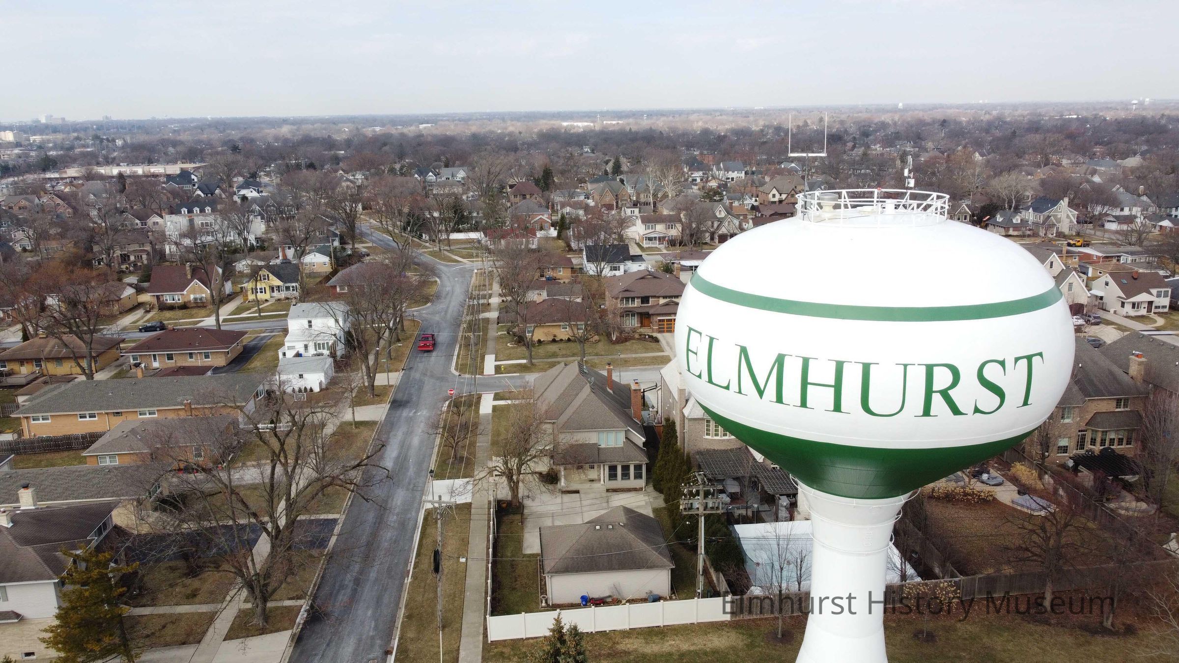 Aerial view of the water tower at Butterfield Park looking west down E. Adams Street.Photograph Details