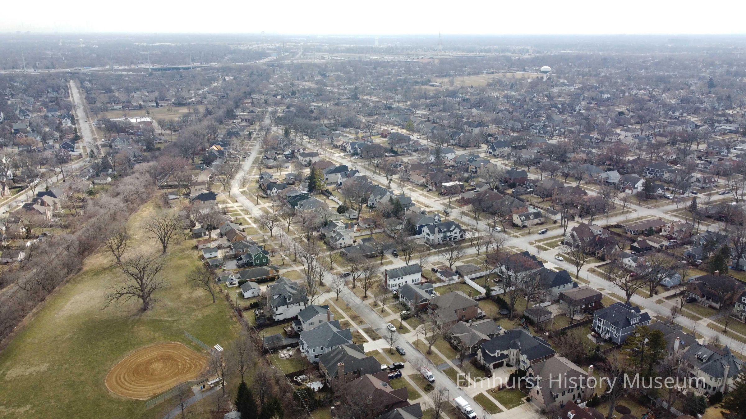 Aerial view of Cayuga Avenue along York Commons Park, looking east.Photograph Details