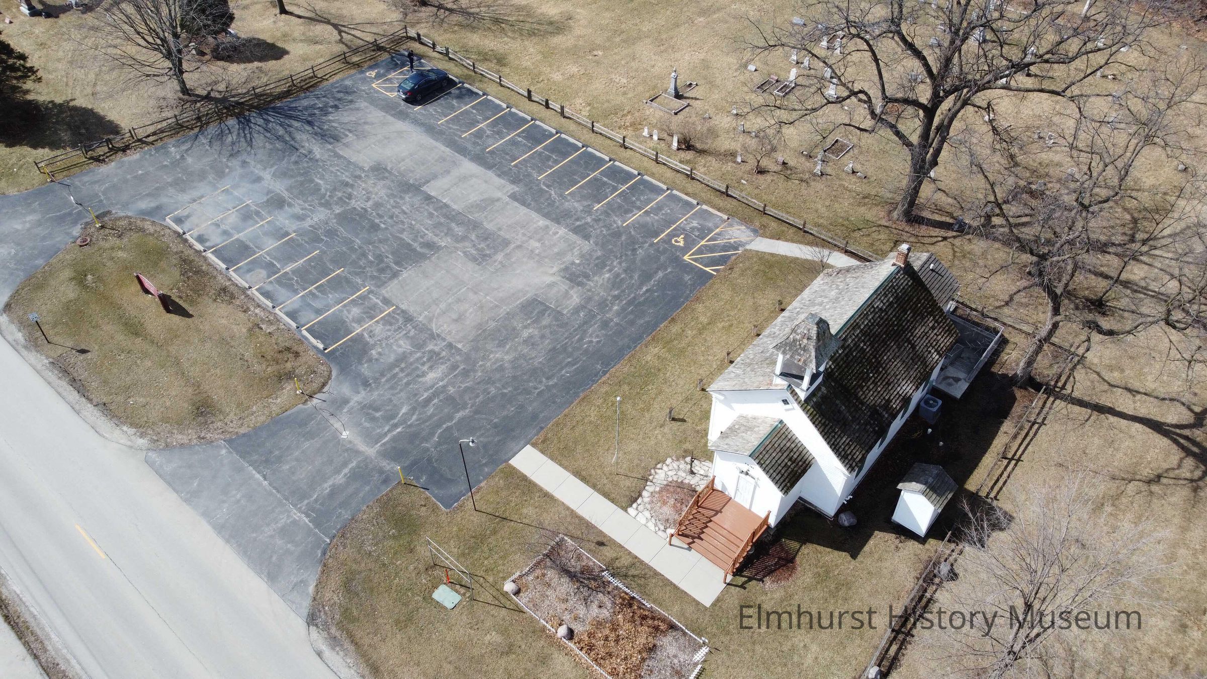Aerial view of the Churchville one-room schoolhouse on the west side of Church Road, north of Grand Avenue. The Churchville Cemetery is behind the school.Photograph Details
