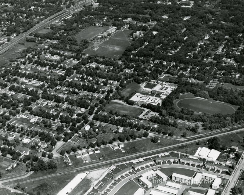 Aerial View of College View Terrace Subdivision behind York Community High School, looking northeast. Elmhurst College can be seen in the background.Made/Created