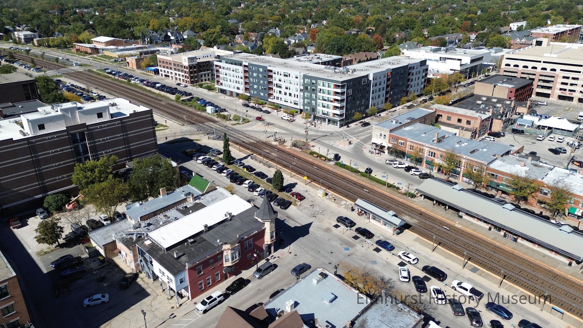 Aerial view of downtown Elmhurst at the Cottage Hill Avenue - Addison Avenue railroad crossing, looking northwest towards The Marke Apartments at 100 N. Addison.Photograph Details