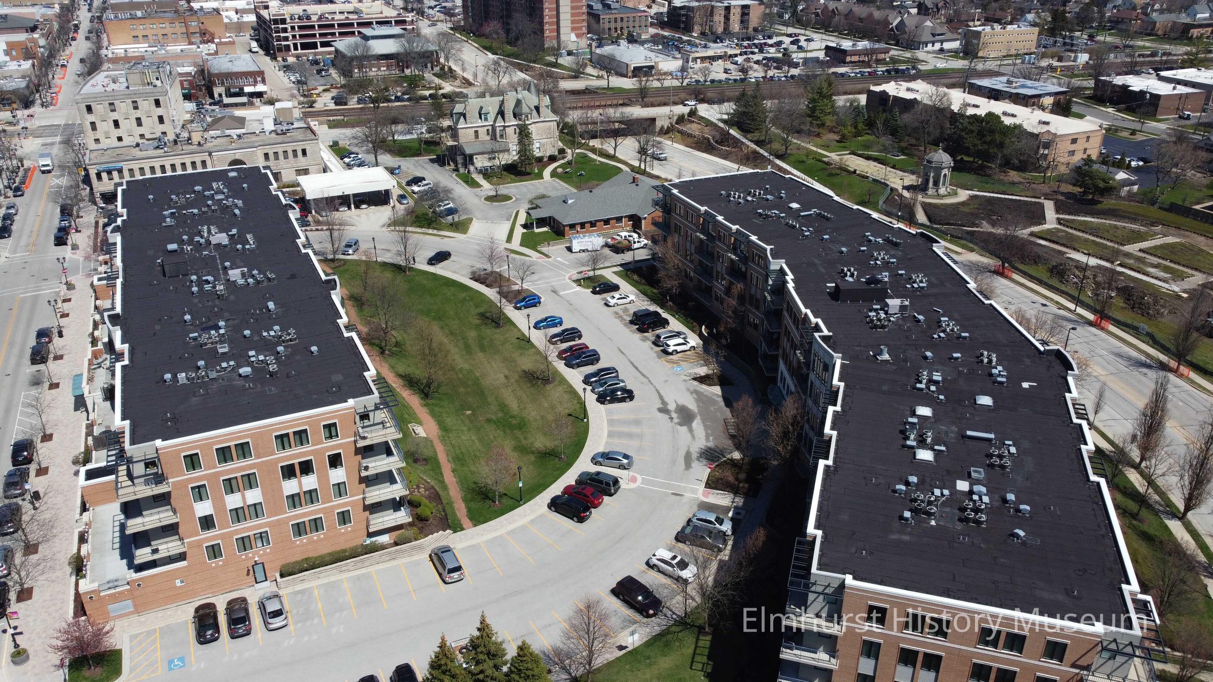Aerial view of Crescent Court Condominiums between S. York Street and Paler Drive, looking north towards the Elmhurst History Museum.Photograph Details