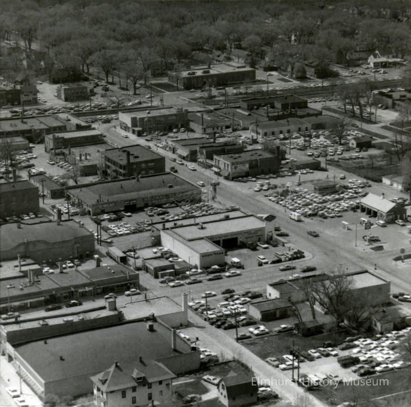Aerial view of downtown Elmhurst, looking southwest towards the intersection of Addison and First Street.Photograph Details