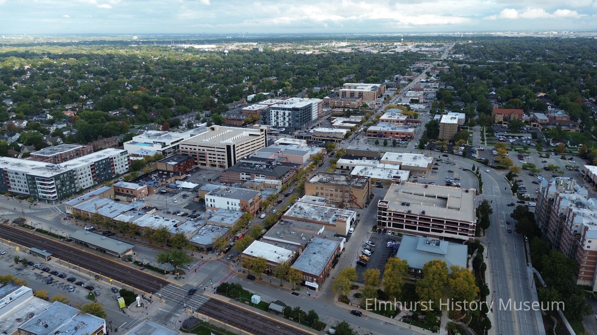 Aerial view of Elmhurst's central business district looking north from First Street. The drone camera is approximately above the Elmhurst History Museum.Photograph Details