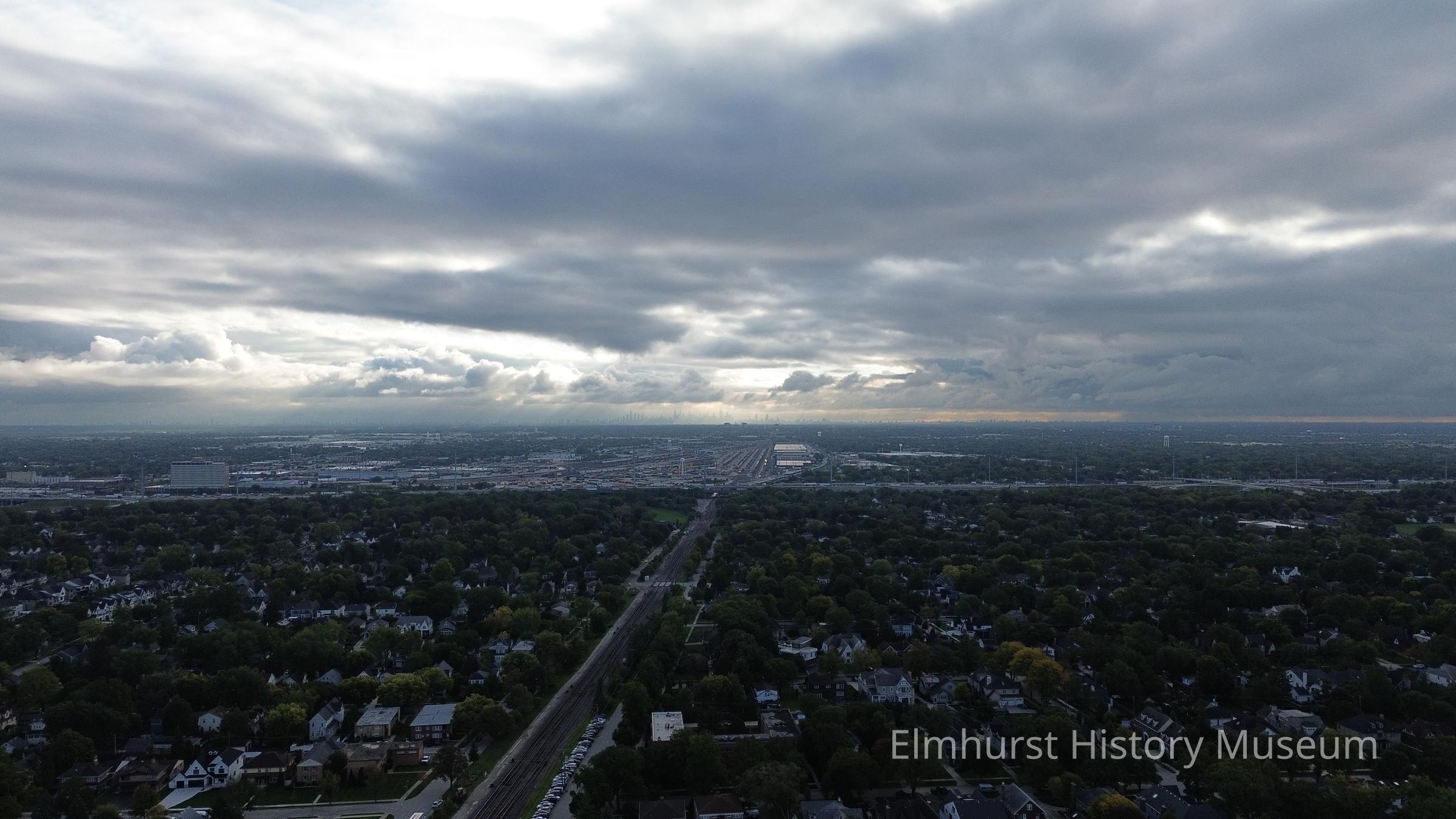 Aerial view Elmhurst looking east along the Union Pacific railroad tracks. The Chicago skyline can be seen in the distance. The drone camera is approximately above the Elmhurst History Museum.Photograph Details