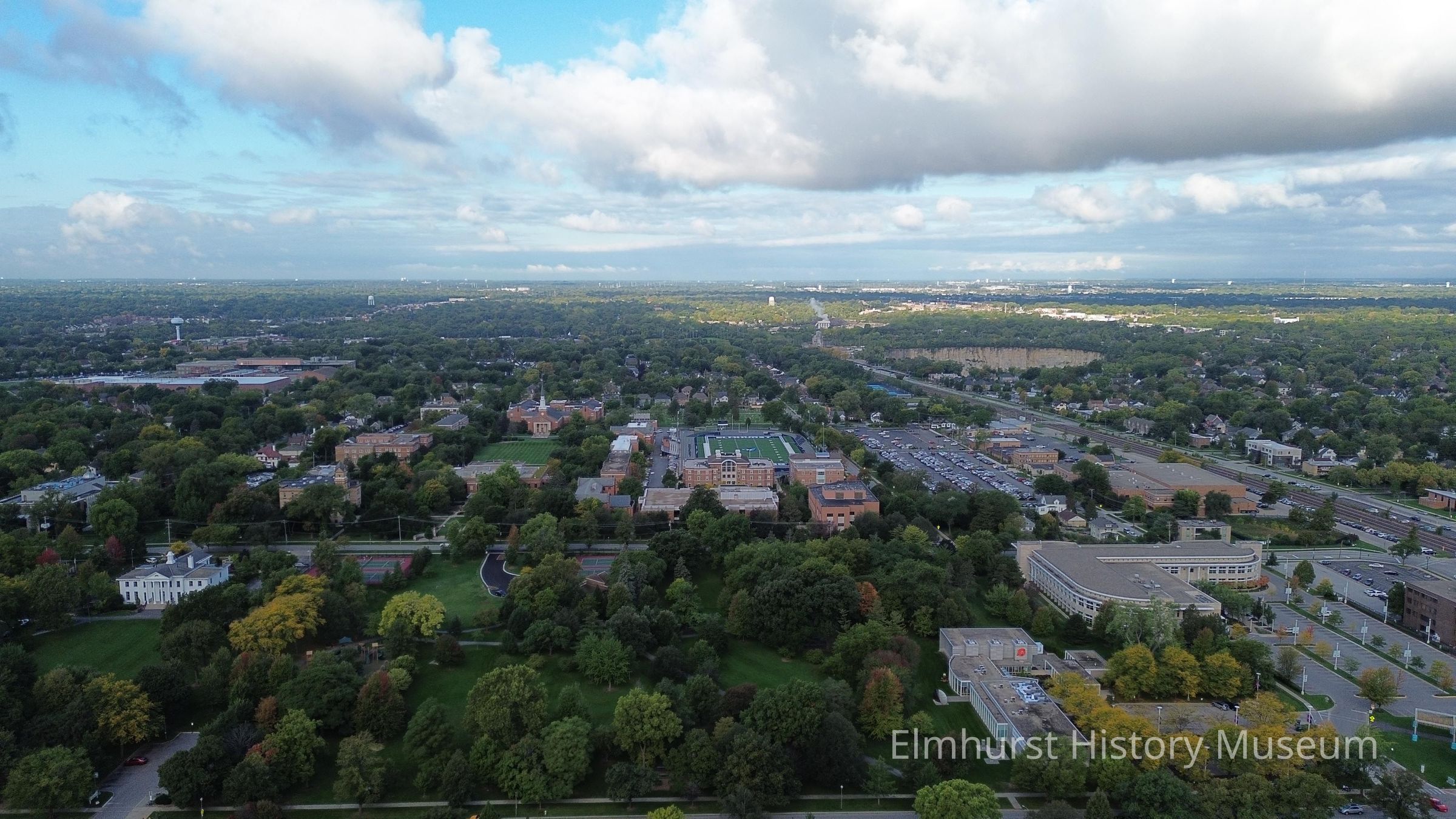 Aerial view of Elmhurst looking west towards Elmhurst University. The photograph is taken via drone above the 105 S. York bank building.Photograph Details