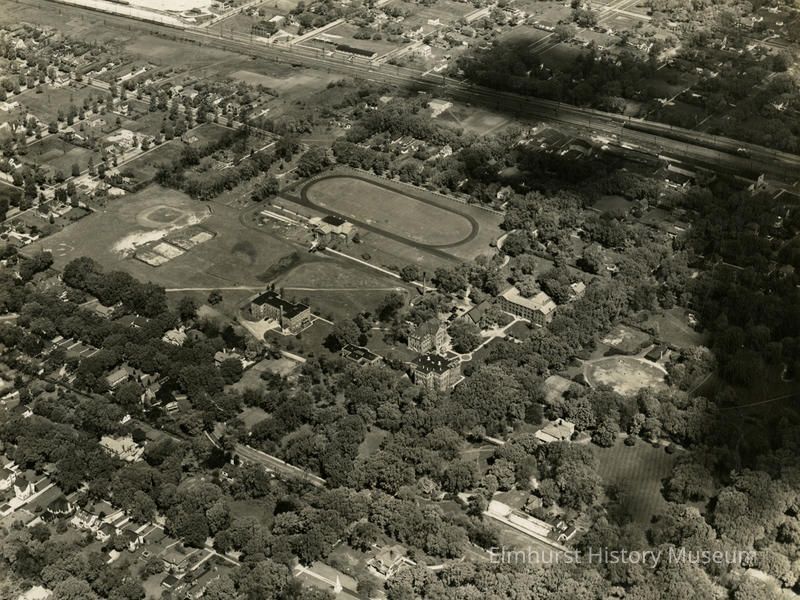 Photograph of an aerial view of Elmhurst College, looking northwest.
